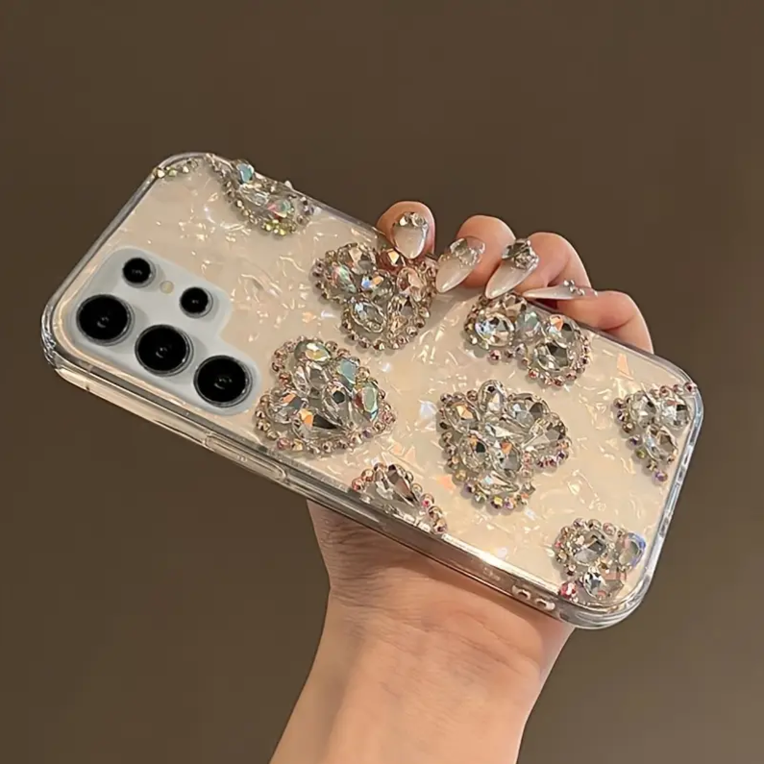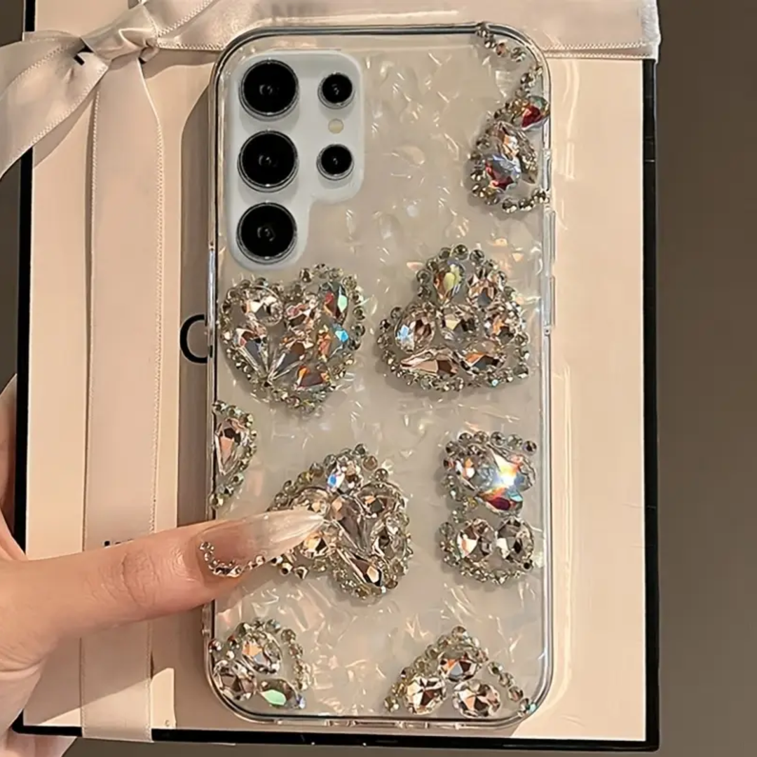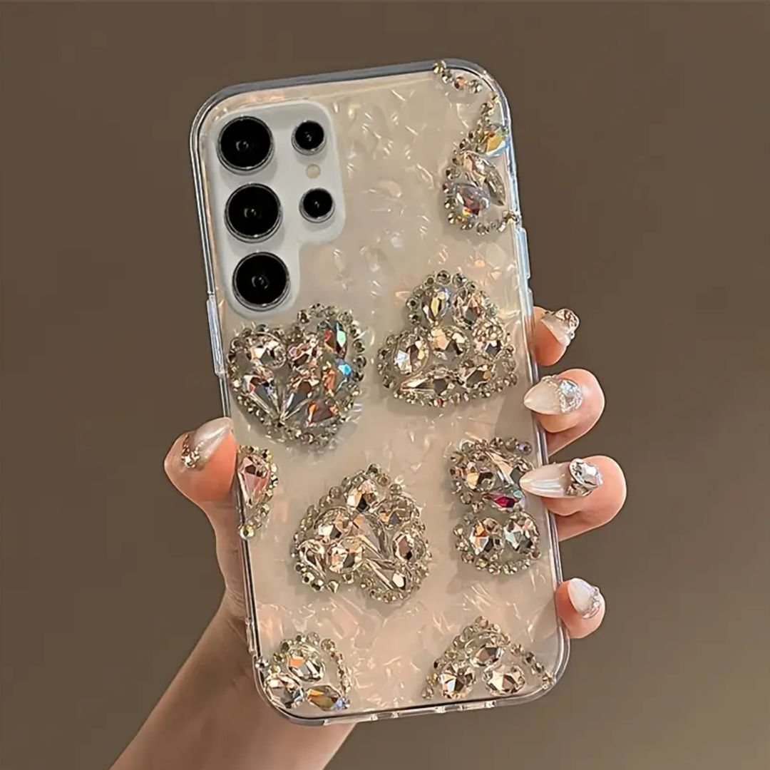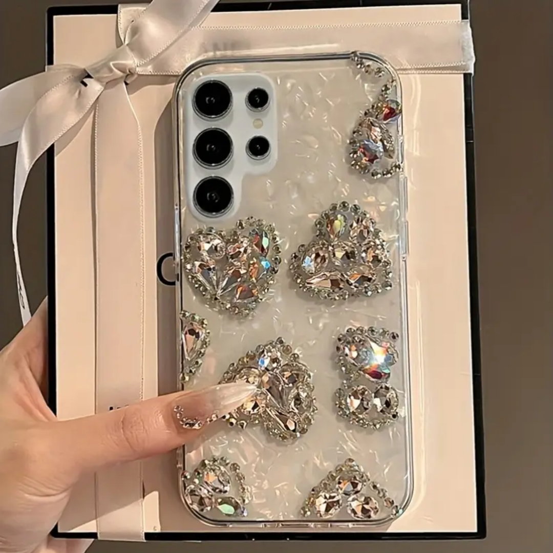 Add a touch of sparkle to your phone with this stunning 3D gradient case. The laser rhinestone design enhances the heart-shaped accents, giving your device a glamorous and chic look.