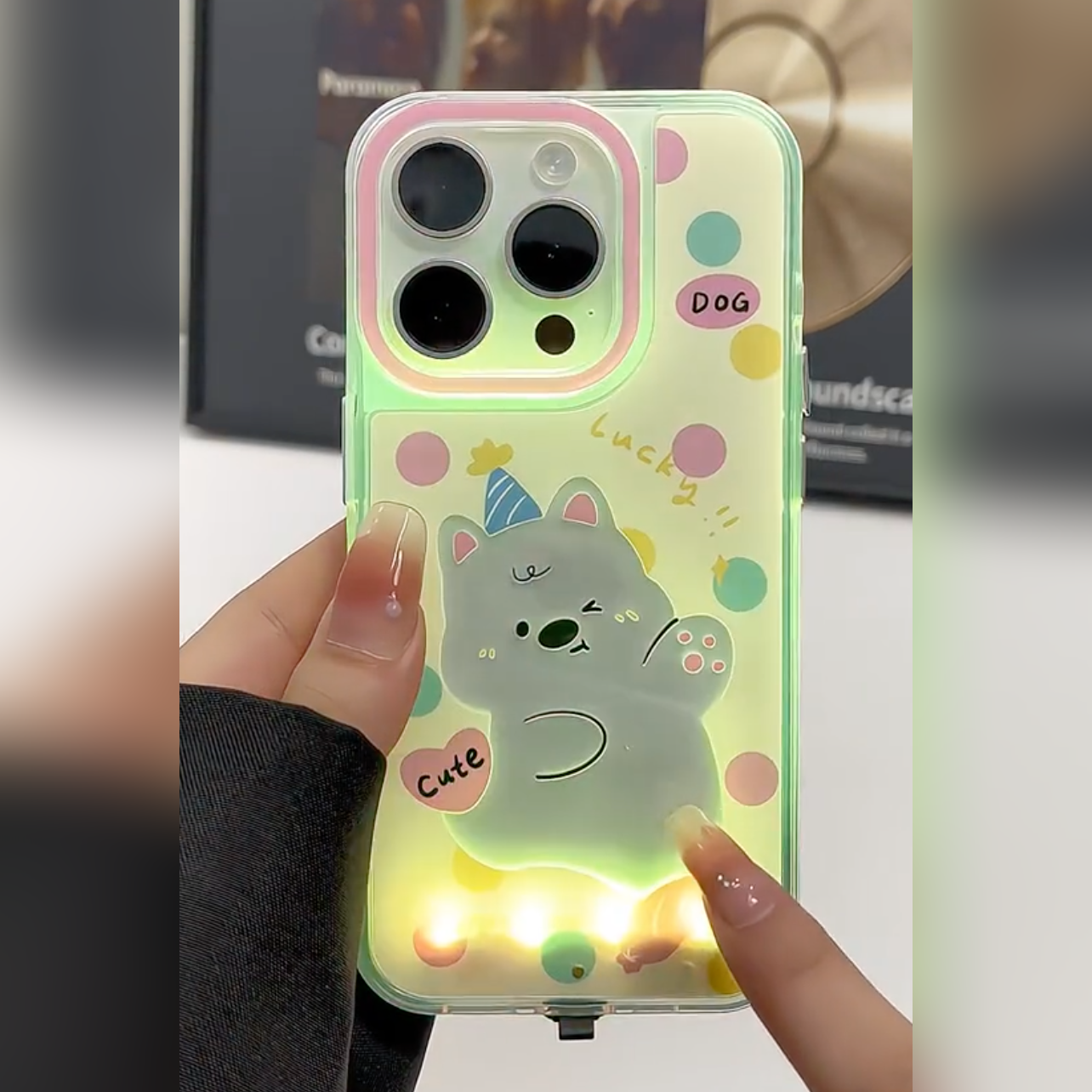 Add a splash of fun to your phone with the Adorable Glow Cartoon Case! This LED-illuminated case features a playful cartoon character that lights up with a soft glow, giving your phone an extra layer of charm and visibility. The pastel polka dots and cute "lucky" theme make it ideal for those who love kawaii designs. Enjoy reliable protection in a slim, lightweight case that keeps your phone safe and stylish!
