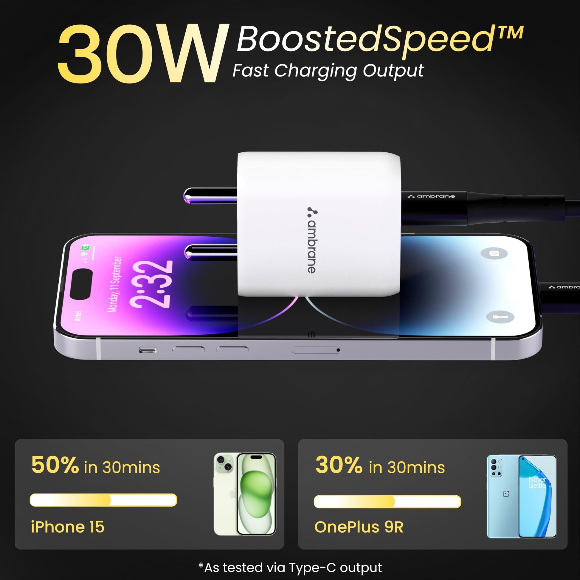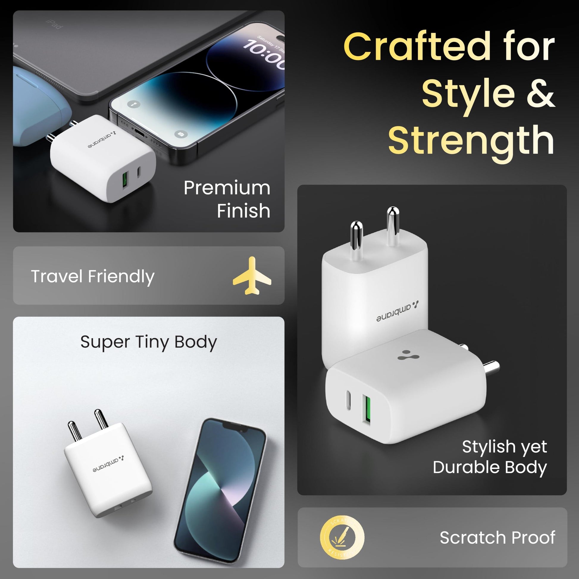Ambrane 30W USB & Type C Fast Charger with QC & PD Technology, Fast Charging Compatible with iPhone, iPad, Samsung Galaxy, Note, Redmi, Mi, Oppo,Smartphones and More (RAAP H30, White)