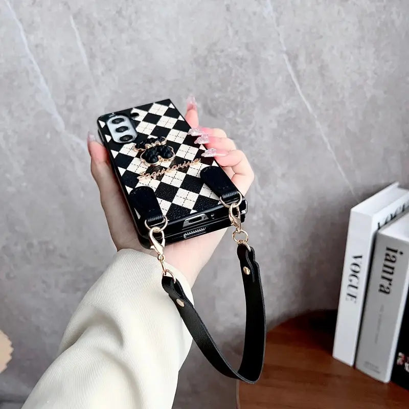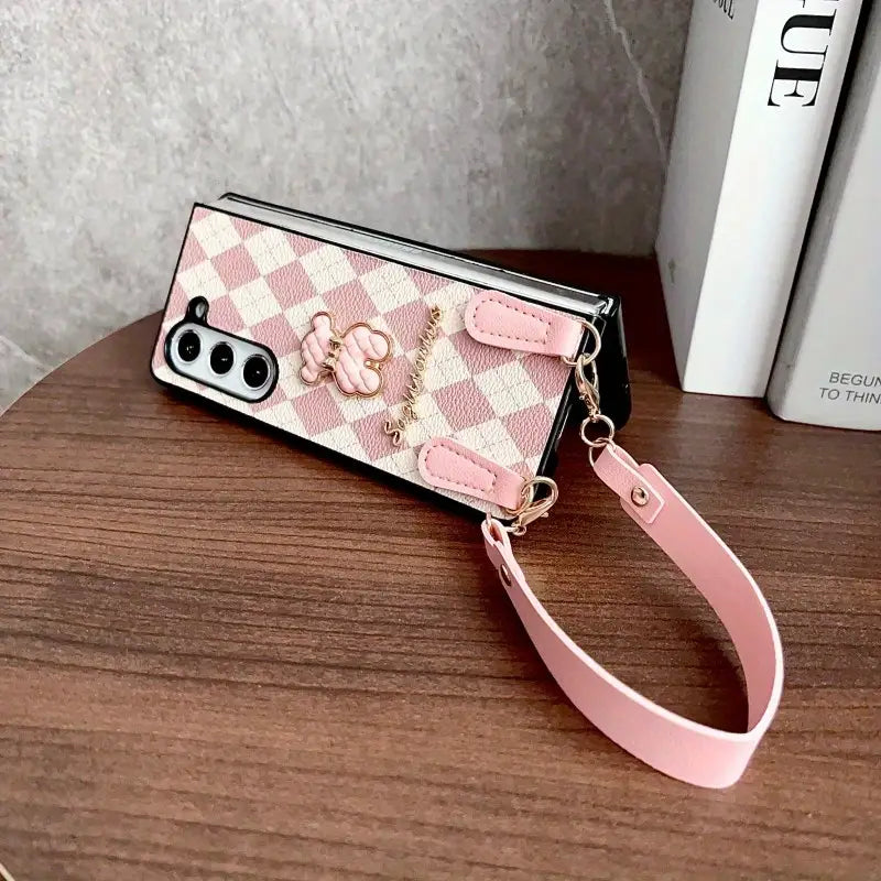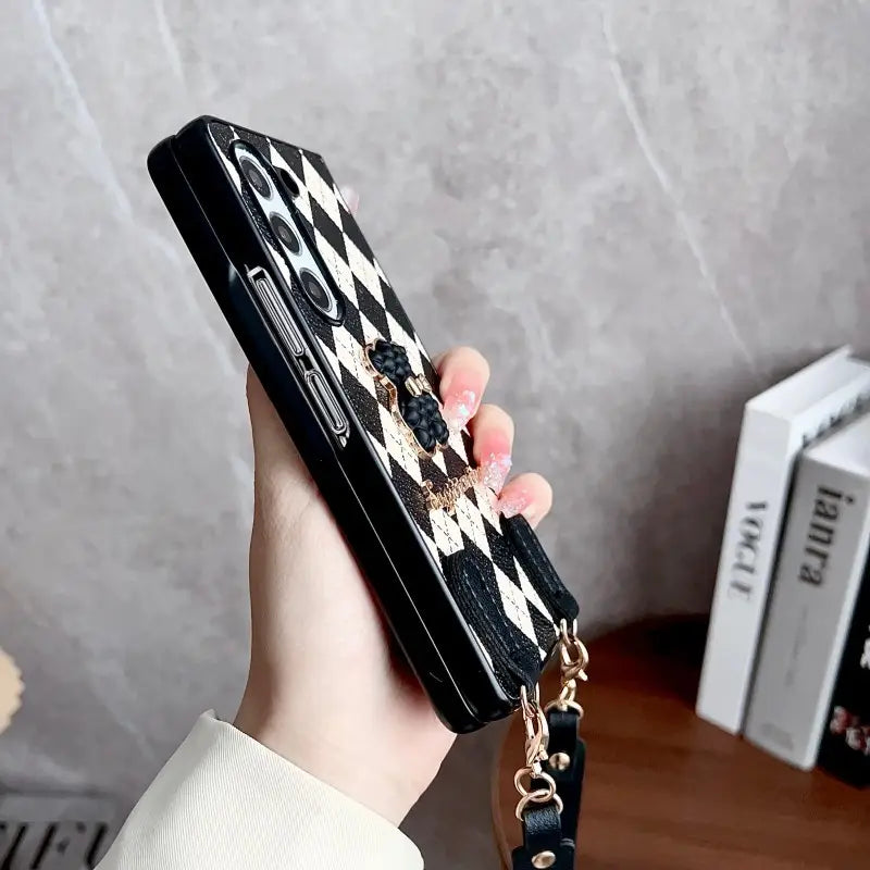 Add a touch of classic charm to your phone with the Argyle Charm Teddy Sling Phone Case for Samsung. Featuring an elegant argyle pattern paired with a 3D teddy charm, this case combines timeless style with modern functionality. The attached leather sling strap adds convenience, allowing you to carry your phone effortlessly.