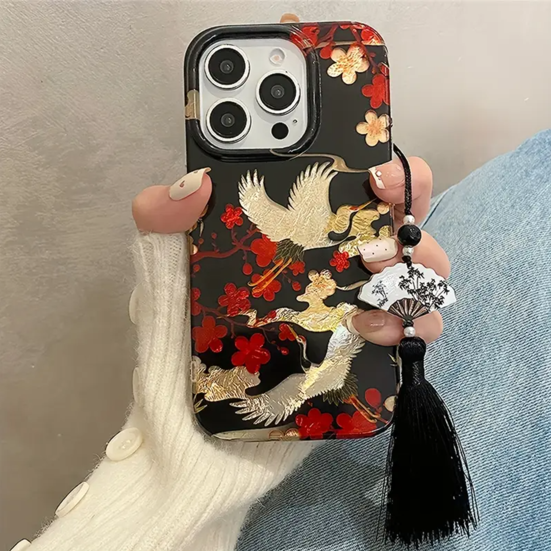 Delicate plum blossoms dance around a majestic crane in a beautiful fusion of nature and elegance. This design offers a graceful touch to your phone, with a calming and timeless aesthetic that adds a unique flair.