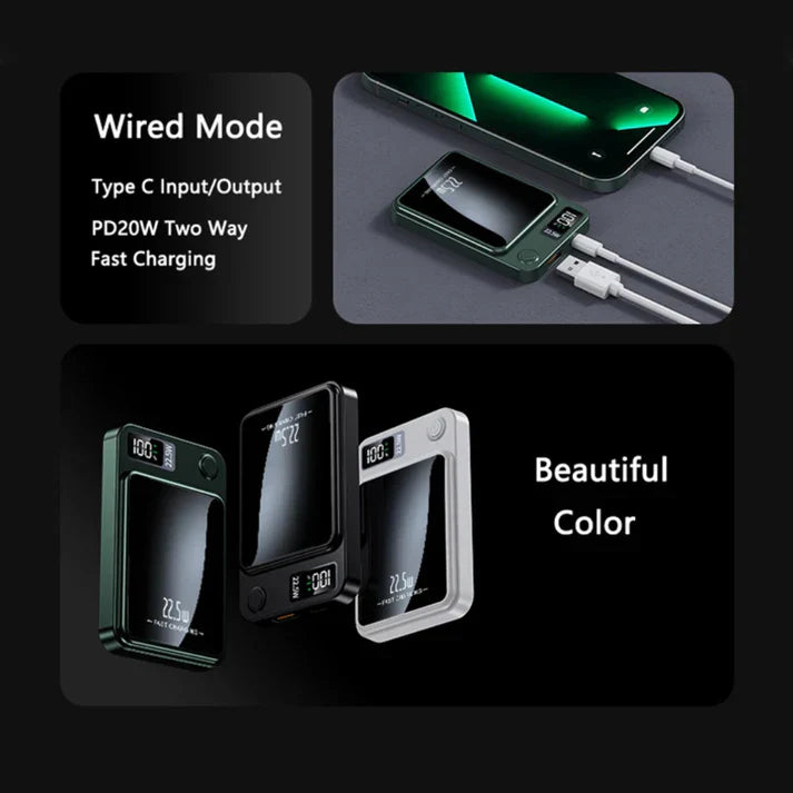 Introducing our Dual 5000 mAh 22.5W Magnetic Wireless Power Bank, designed to provide a seamless charging experience for your devices. With an impressive 22.5W of fast charging capability, this two-way charger ensures your smartphones and accessories are powered up quickly and efficiently.