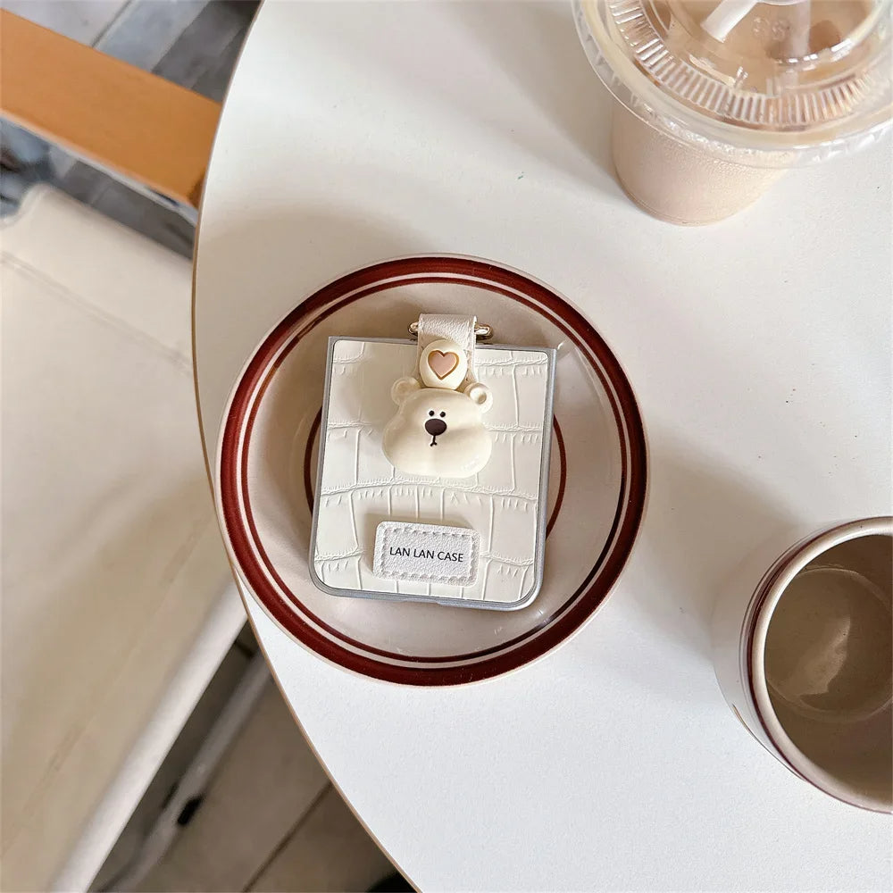Upgrade your style with this trendy and protective phone case. This case seamlessly blends fashion and function, featuring a unique white crocodile-embossed texture, a convenient finger ring, and an adorable detachable teddy bear charm.