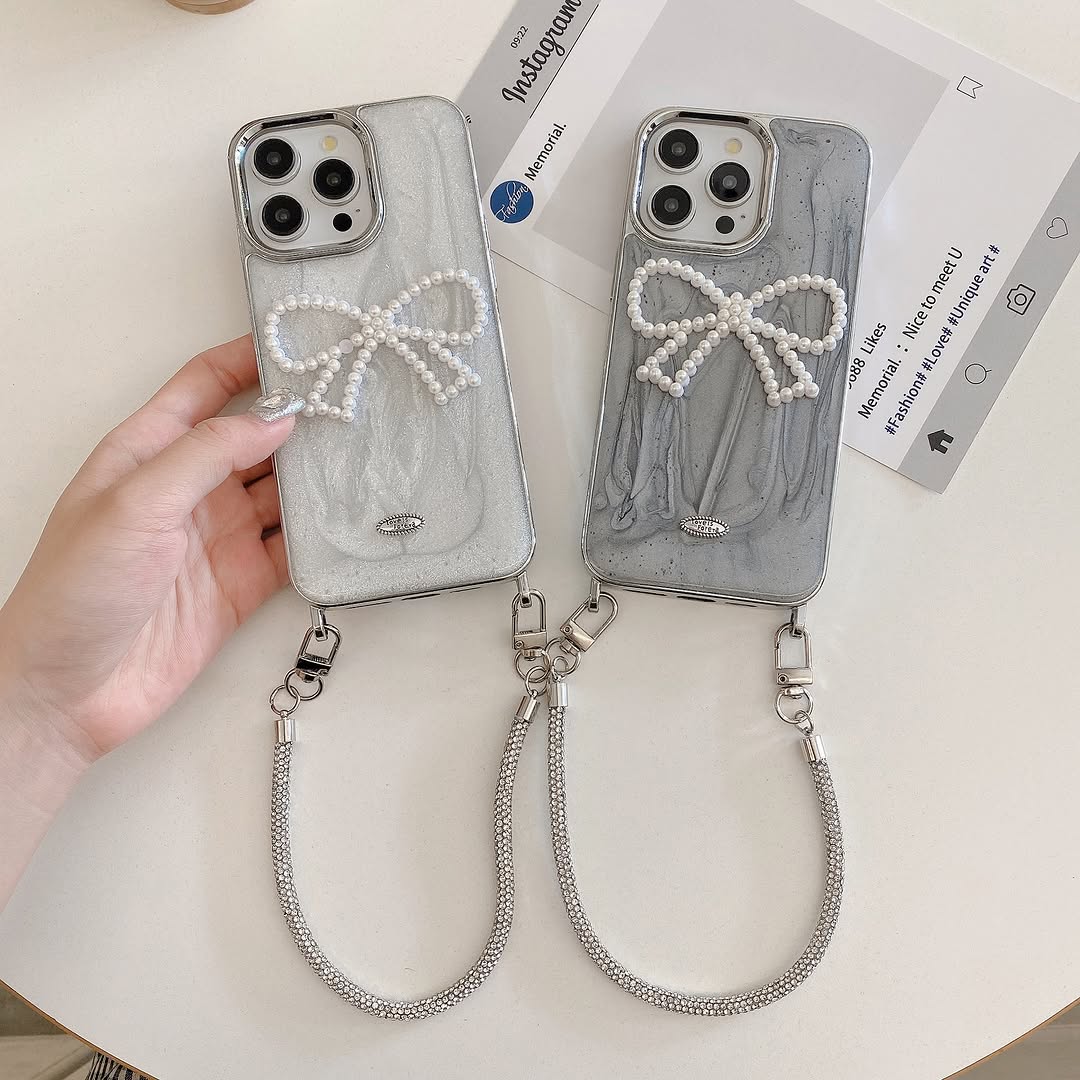 Turn your phone into a fashion statement with this charming phone case designed exclusively for girls who love elegance. Featuring a delicate pearl-embellished bow and a stylish detachable strap for hands-free convenience, this case is as functional as it is beautiful.