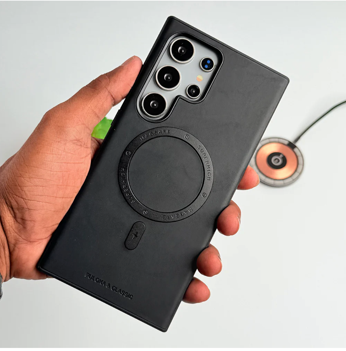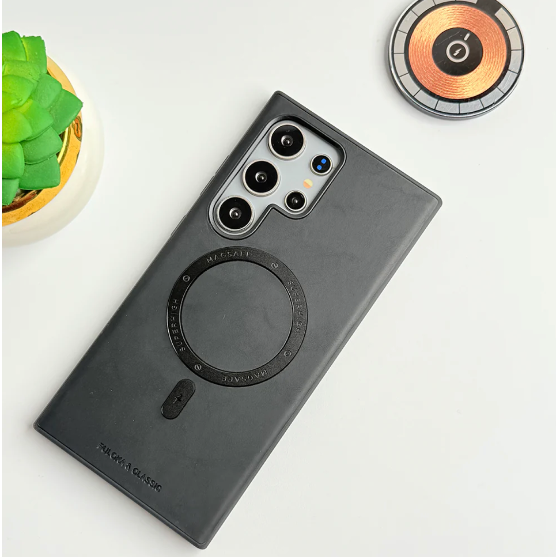 The Elite Shield Leather MagSafe Ring Holder Case offers premium protection and unmatched functionality for your Samsung device. Crafted from high-quality leather, this case provides a sleek, luxurious feel while ensuring robust protection. The integrated MagSafe-compatible metal ring holder adds a convenient grip and doubles as a sturdy kickstand, making it perfect for hands-free use. Designed to combine style, convenience, and security, this case is the perfect accessory for your Samsung.
