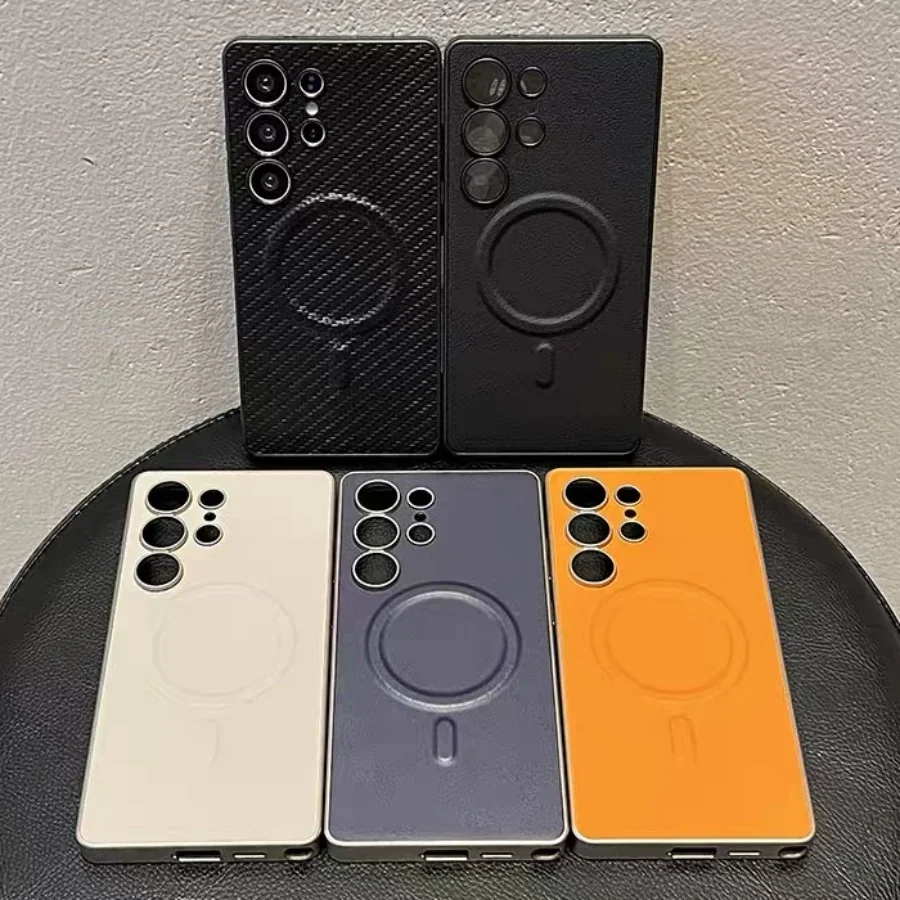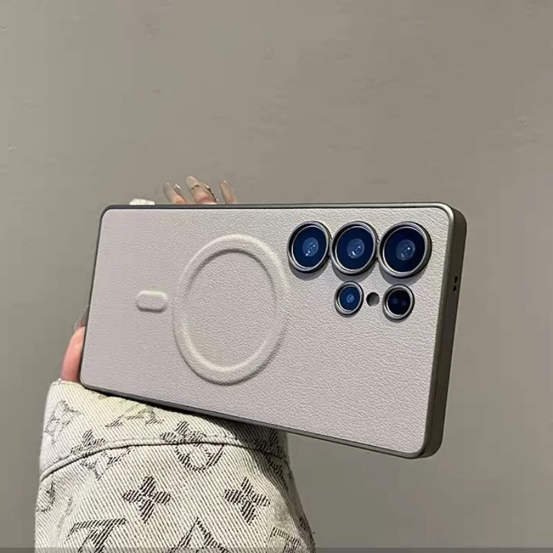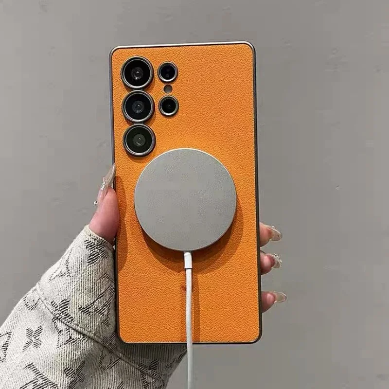 Elevate your Galaxy S25 Ultra with the Elegant Magnetic Leather Case, designed to combine style, durability, and functionality. This premium case features a smooth leather texture in a vibrant orange color, delivering a sleek, professional look while offering excellent protection. With a built-in magnetic ring, this case supports MagSafe wireless charging and attaches seamlessly to compatible magnetic accessories. Slim yet sturdy, the case is designed to safeguard your phone from scratches, bumps, and daily wear without adding bulk.
