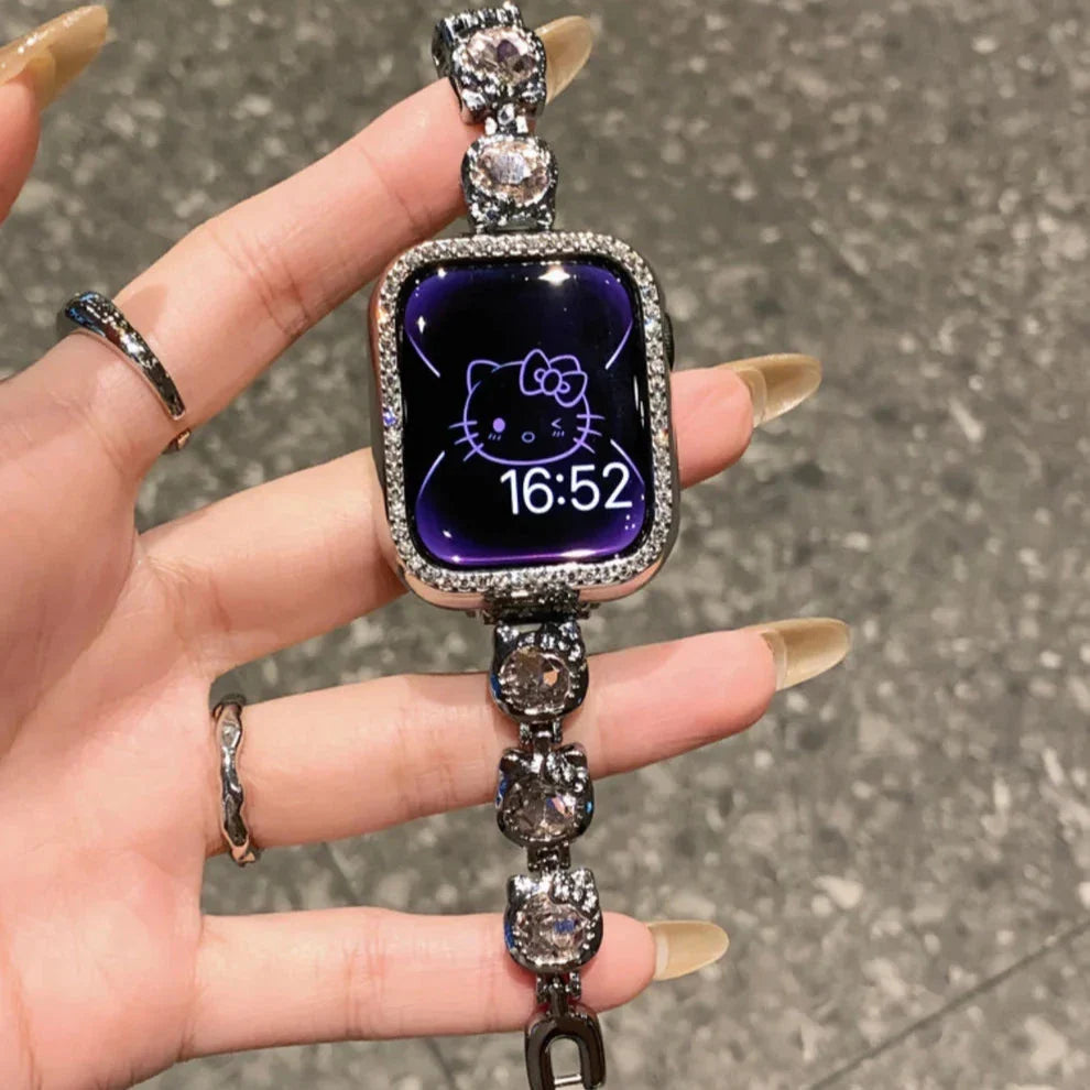 Add a playful yet sophisticated touch to your Apple Watch with the Hello Kitty Diamond Bracelet Band. Featuring the iconic Hello Kitty charm and a sleek black diamond design, this bracelet band perfectly blends luxury and fun.