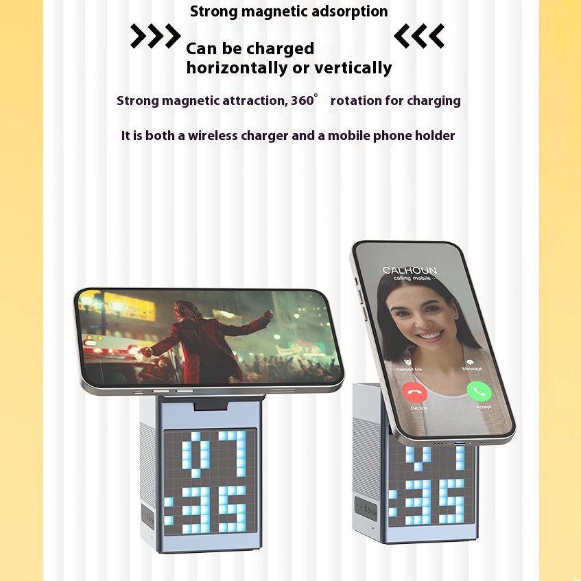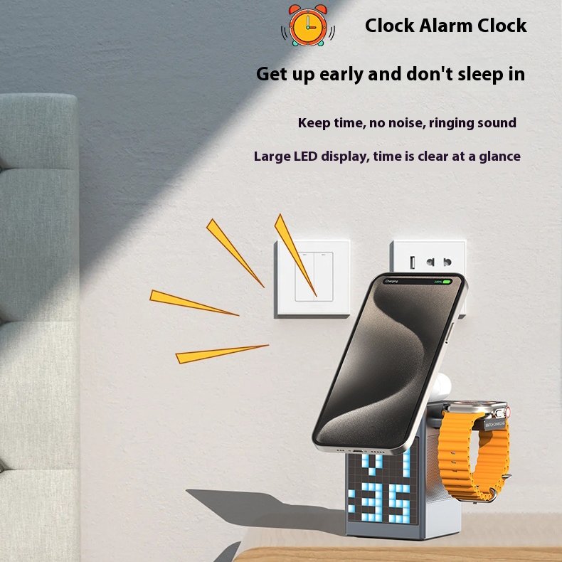Experience the ultimate convenience with this Hybrid 3-in-1 Wireless Charger with Speaker and Clock. Designed for the modern lifestyle, this sleek and efficient device combines wireless charging, high-quality audio, and a digital clock into one compact station. Perfect for home or office use, it keeps your space clutter-free while ensuring all your essentials are within reach.