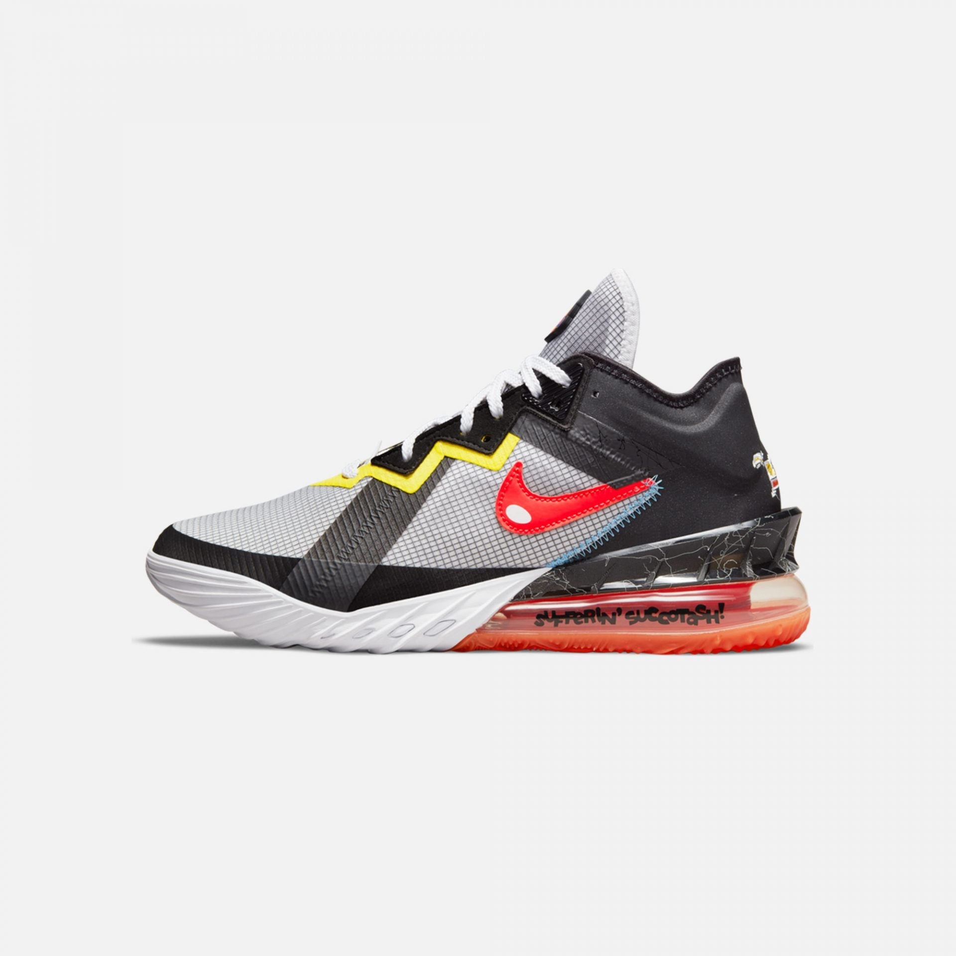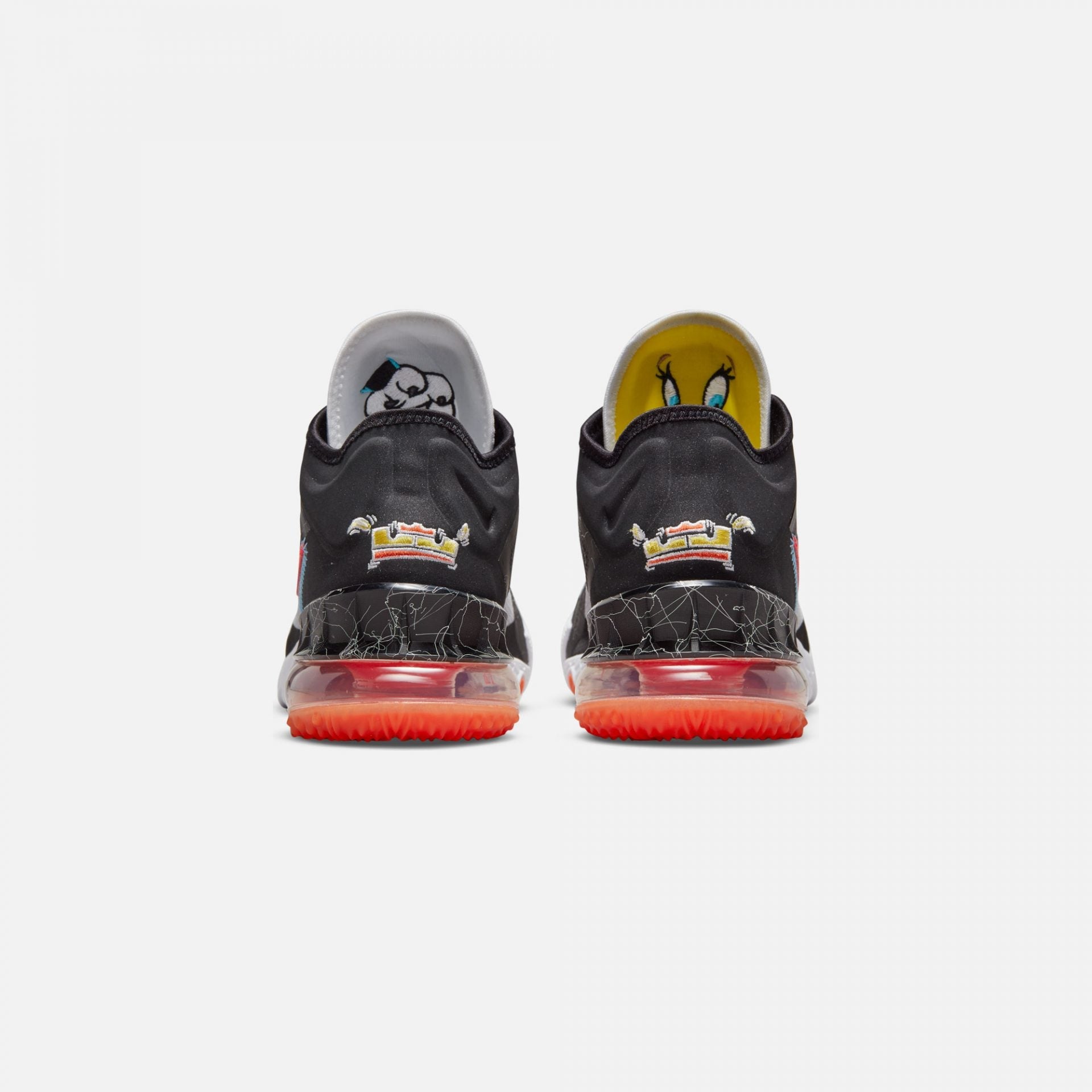 Sufferin' succotash!It's Tunes vs Goons in the long-awaited basketball blockbuster, Space Jam: A New Legacy.Nike Basketball celebrates the showdown with a fun take on the LeBron 18 Low.The shoe is light yet strong, with responsive cushioning tuned for LeBron's fast, powerful gameโand perfect for taking on a squad of Goons in space.'Sylvester vs Tweety' plays on the predatory puddy cat's non-stop attempts to snack on the sweet, little canary, who always has the moves to frustrate the feline, whether in the bird cage or on the basketball court.
