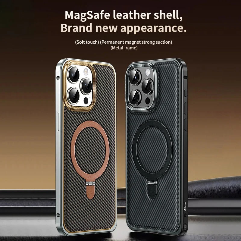 Elevate your iPhone's protection and style with the Luxury Guard Metal Frame Carbon Fiber Bracket Case. This premium case combines cutting-edge design with high-end materials to deliver unparalleled defense against everyday wear and tear. Featuring a sleek metal frame that enhances durability, this case is complemented by a carbon fiber texture that adds a modern and sophisticated touch.
