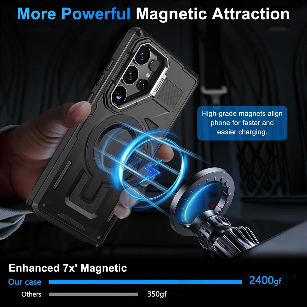 This military-grade case is designed to provide ultimate protection while featuring a built-in camera stand for convenient viewing. It combines rugged durability with practicality, ensuring your Samsung device stays safe and functional in any situation.