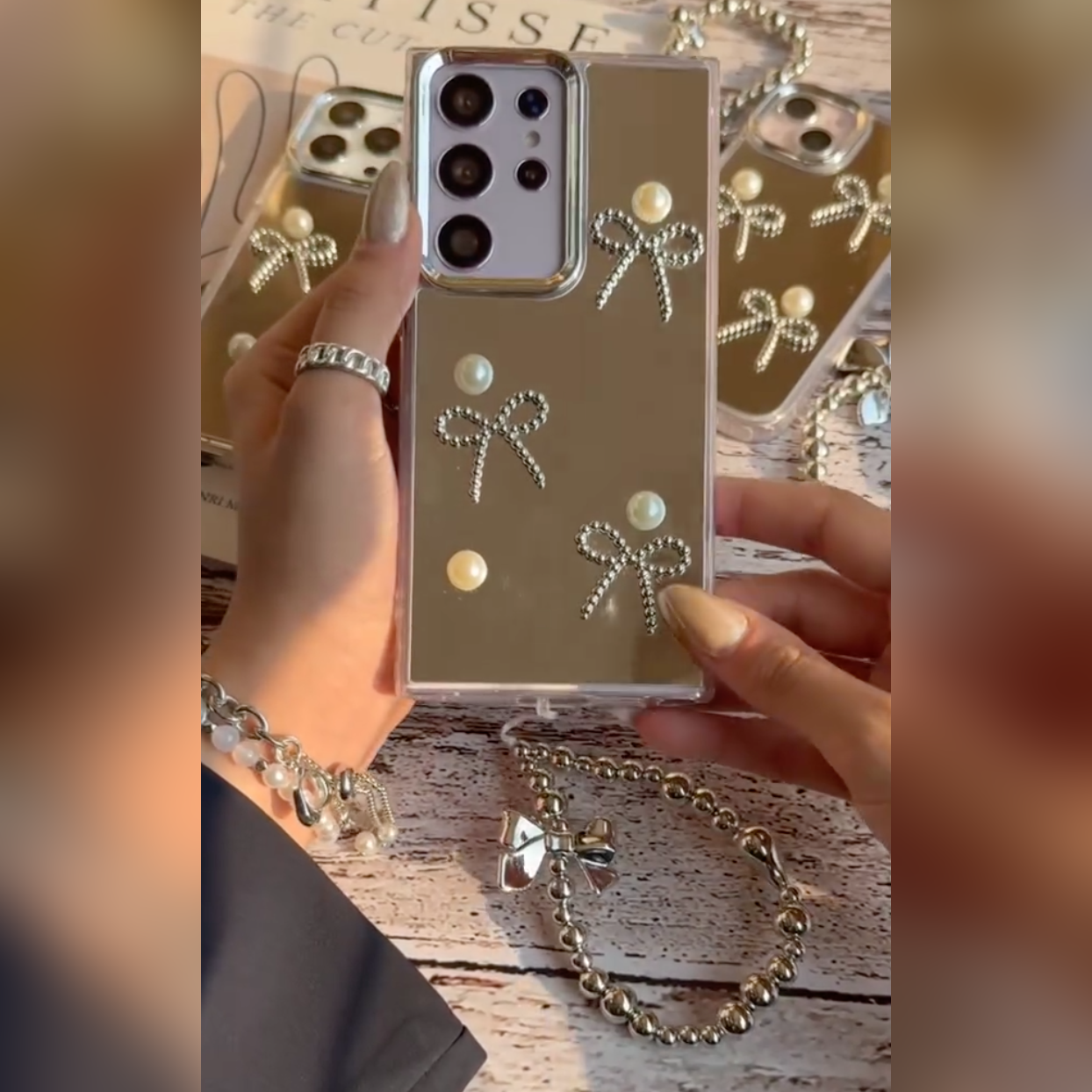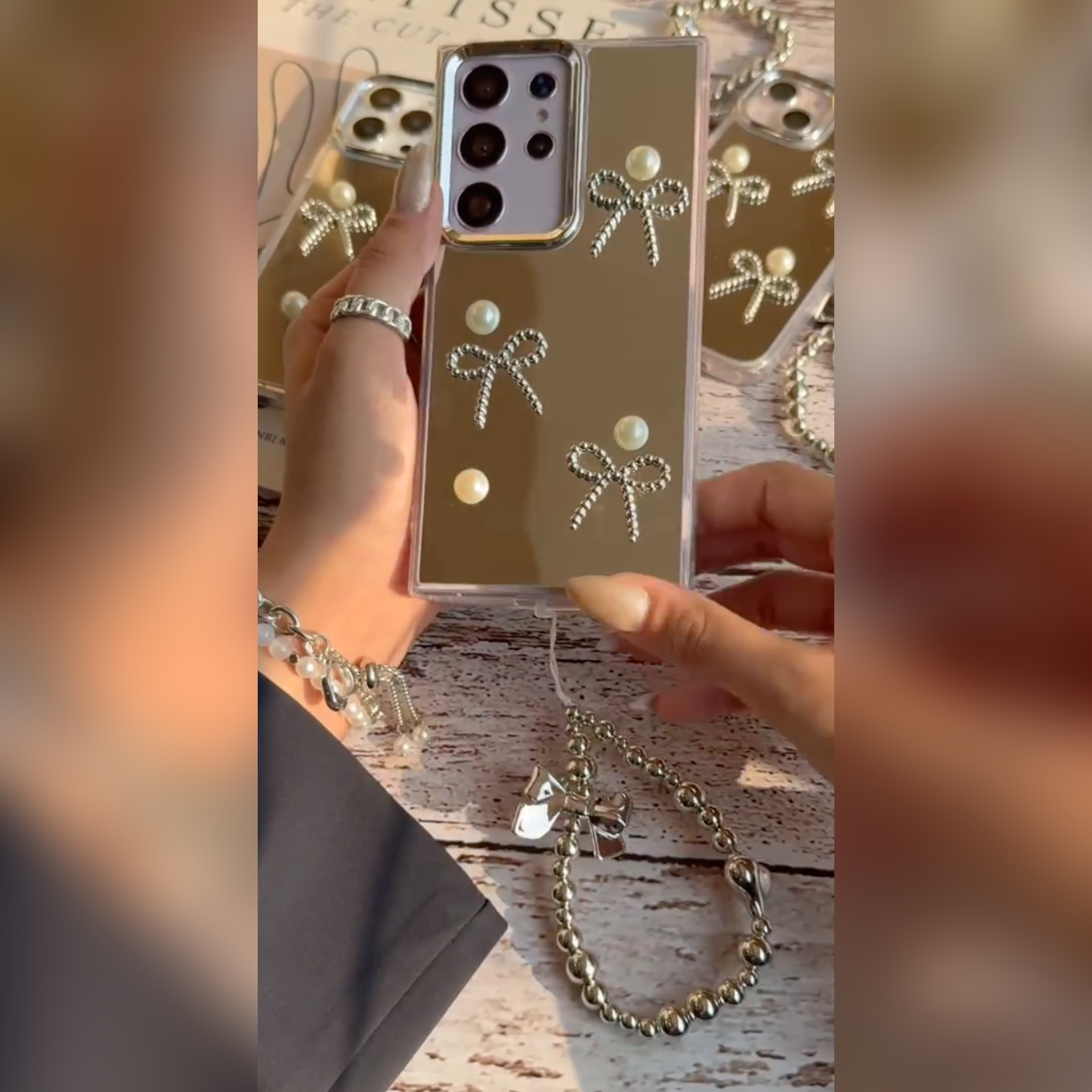 Elevate your phone with the luxurious Mirror Pearl Bow Case, featuring a stunning mirrored surface with a charming pearl-accented bow.