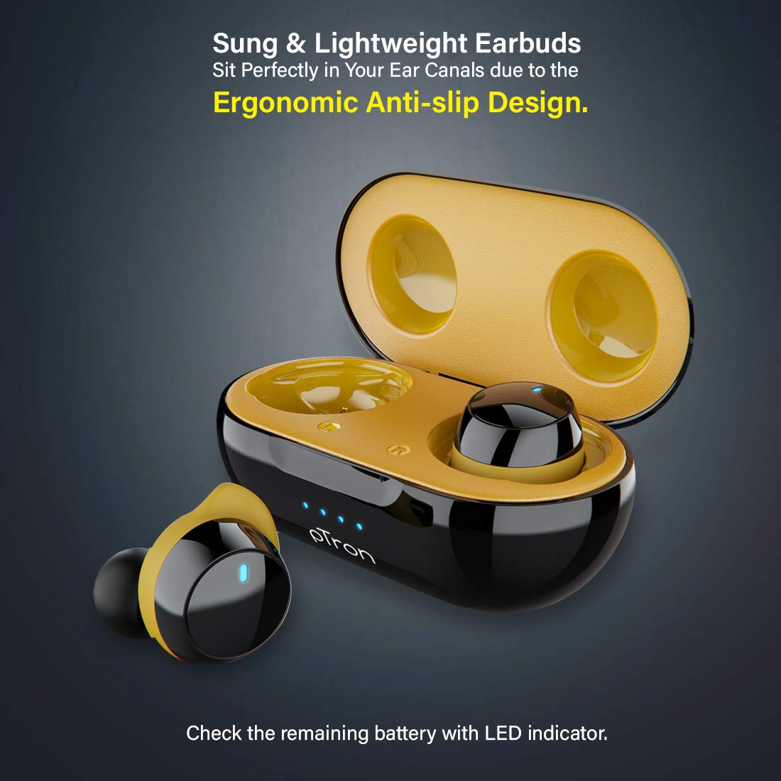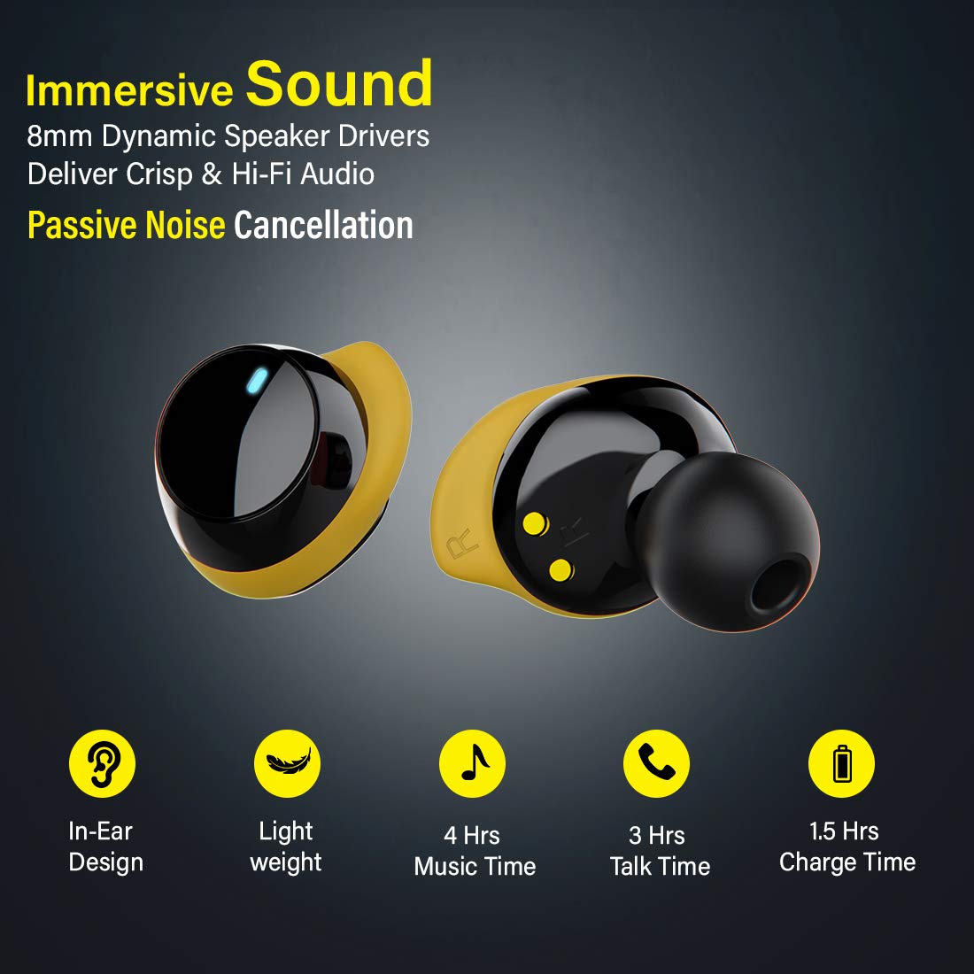 pTron Bassbuds Elite True Wireless Headphones (TWS), Bluetooth 5.0, Hi-Fi Sound with Bass, Auto Pairing, Passive Noise Cancellation, Voice Assistance, 12Hrs Playtime with Case & Mic - (Black & Yellow)