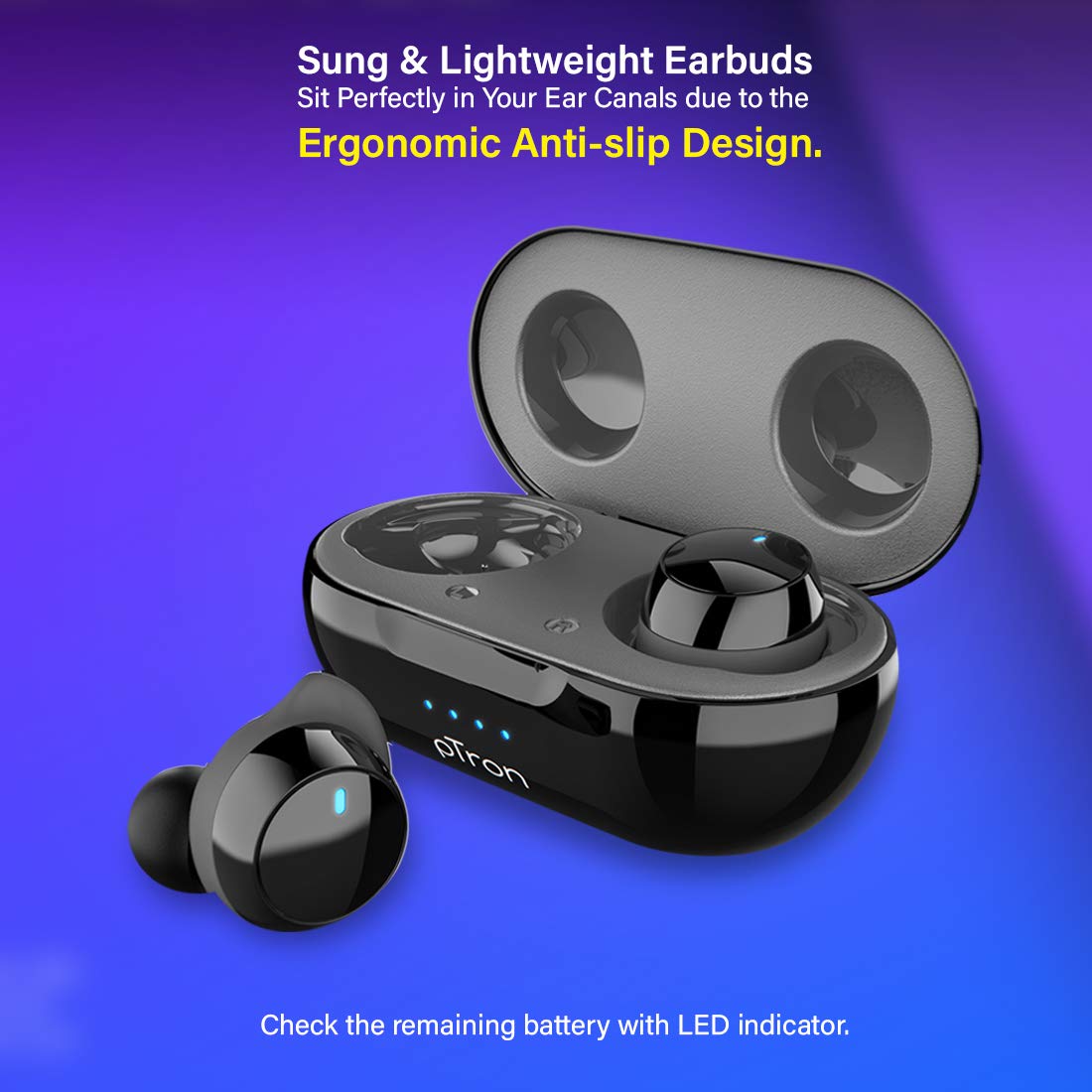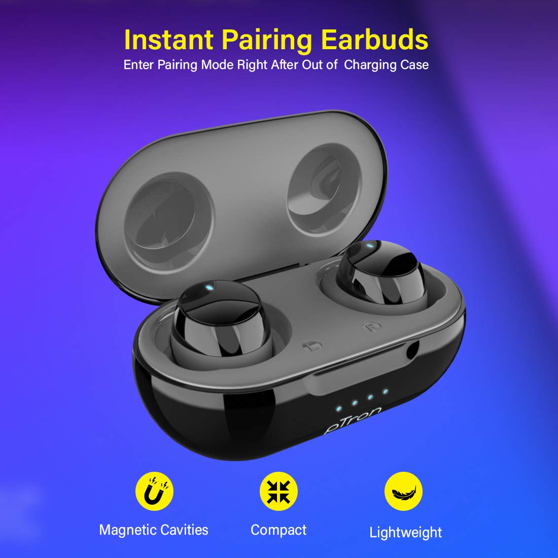 pTron Bassbuds Elite True Wireless Headphones (TWS), Bluetooth 5.0, Hi-Fi Sound with Bass, Ergonomic Earbuds, Auto Pairing, Passive Noise Cancellation, Voice Assistance & Built-in Mic - (Black & Grey)