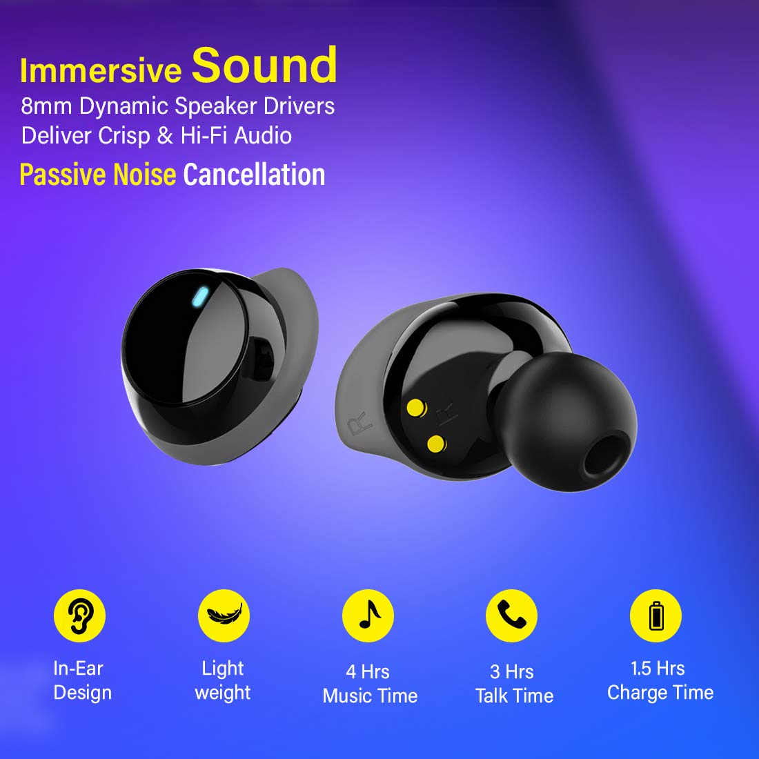 - Bluetooth 5.0; Fast Pairing; 10m Wireless Range; 4 Hours Playback Time (Earbuds) & 8 Hours Extended Playtime using Charging Case; 3 Hours Talk-time; 1.5 Hour Charge Time