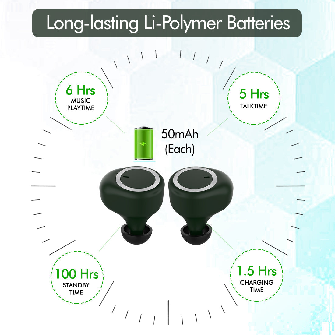 - Bluetooth 5.0; 6 Hours Playback Time (Earbuds) & Extended Playtime up to 20 Hours with the Charging Case; 5 Hours of Talk-time; 1.5 Hours Charging Time; 100 Hours of Standby-time