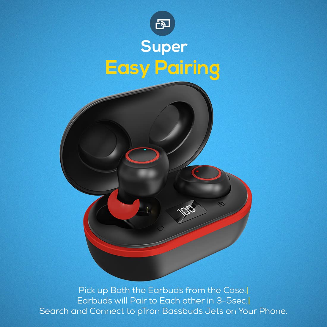 PTron Bassbuds Jets Bluetooth Truly Wireless In-Ear Headphone With Mic (Black and Red)