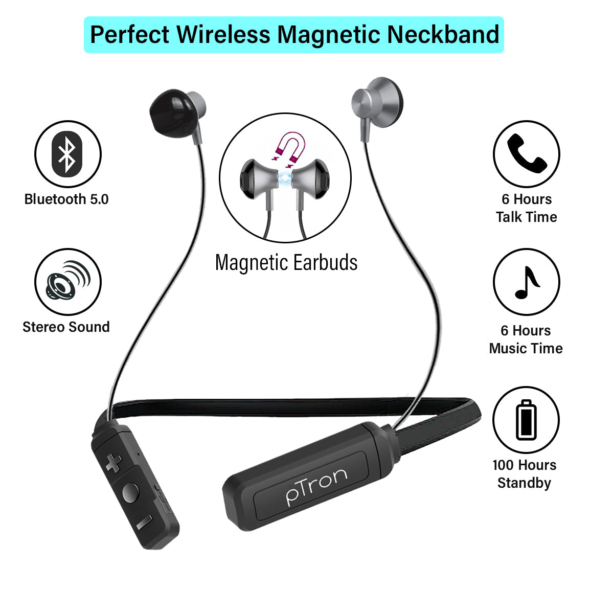 pTron InTunes Plus In-Ear Magnetic Wireless Headset with Mic - (Grey/Black)