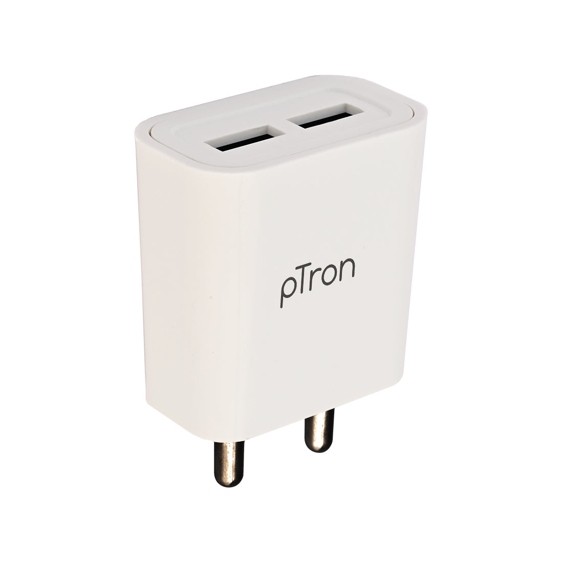 pTron Volta Evo 12W Dual USB Smart Charger, Made in India, BIS Certified, Fast Charging Power Adaptor Without Cable for All iOS & Android Devices - (White)
